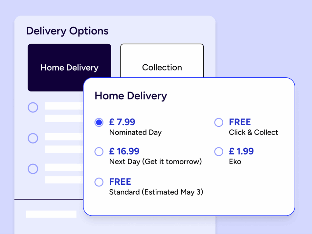 Boostez vos conversions au moment du paiement grâce à un large choix de modes de livraison et des dates de livraison précises, alignées sur votre stratégie d’expédition, pour donner aux clients l’assurance que leurs achats leur seront livrés à temps constamment.
