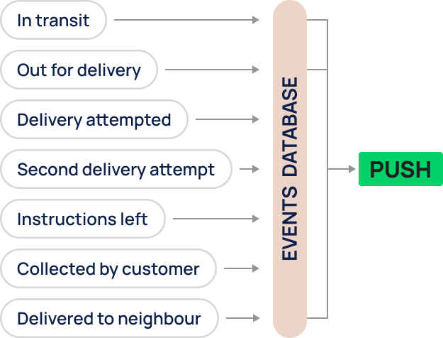 Send your customers normalized notifications detailing high-level events such as ‘In transit’, ‘Out for delivery’, ‘Delivered to neighbor’, and more.